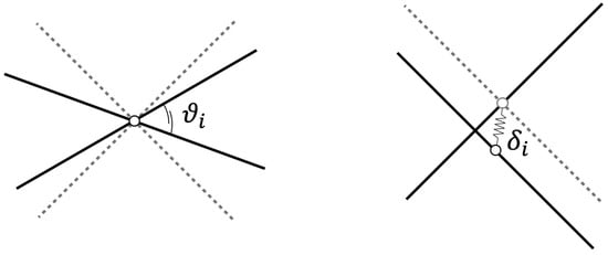 As has been shown, at least two types of deformation are associated with pivots: their torsion and their micro-shear. These deformations affect the fibers as relative deformations between the two parallel layers interconnected by the given pivot. In fact, the torsion of the pivot results in a change in the angle between the fibers, while the micro-shear corresponds to the sliding between such fibers (see Figure 3).
