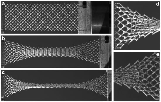 Experimental observation of micro-shear of pivots in an extension test of a 3D-printed specimen. In (a–c), three different deformation stages are shown. In (d,e), the extremities of the sample in (c) are magnified for showing the micro-shear of pivots. The author acknowledges Prof. F. Hild and Mr. X. Pinelli of Paris-Saclay University for their help in performing experimental measures.