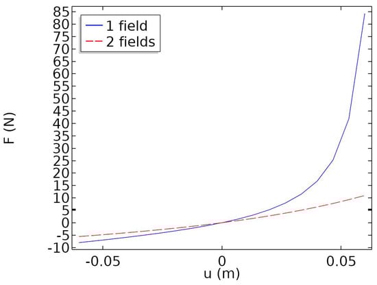 A first fundamental result is shown in Figure 5, where the reaction forces relative to the two models are plotted in terms of the prescribed displacement. As is evident, in the 2-fields model, the curve (red, dashed line) is, with good approximation, symmetric with respect to the origin. This means that the micro-shear of pivots has introduced the possibility to the fiber layers to slide one with respect to the other, allowing, in the end, for a reaction force (or, equivalently, for a total strain energy) lower than in the 1-field model. Such a lowering of the reaction force is understood if one considers that the microstructure can be stretched to the same prescribed displacement, activating two different mechanisms in the two cases: in the 1-field model, the fiber elongation is activated; in the 2-fields model, on the contrary, the fiber layers are sheared, consisting of a global stretching of the microstructure. Obviously, in the second case, the fiber elongation will also be activated, but in a stage of deformation that is associated with a considerably larger prescribed displacement.