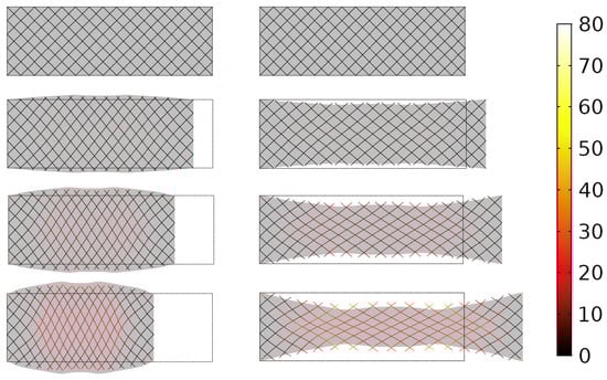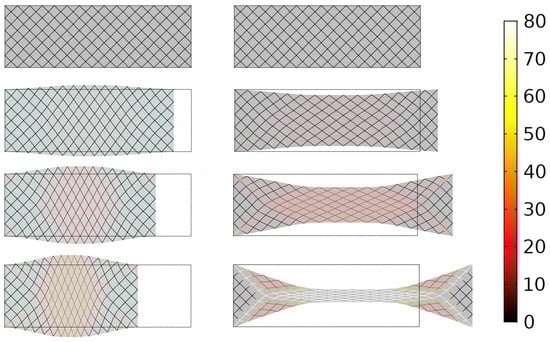Numerical simulations also give as a result the plot of deformed shapes in the axial tests (Figure 6 and Figure 7). In Figure 6, such deformed shapes are shown for the 1-field model, while the same plots are reported for the 2-fields model in Figure 7. By comparison of the two figures, one can simply understand how the sliding of fiber levels allows for a global elongation but with no activation of fiber elongation. In fact, by referring to the last step of deformation in the stretching test for the two figures (right, bottom corner), it is evident that in Figure 7, the fibers swiped each other. Moreover, in the 2-fields model simulations, the transverse depth of the sample proves to be larger than in the 1-field case, thus inducing less fiber elongation (which is activated when the central fibers are in contact).