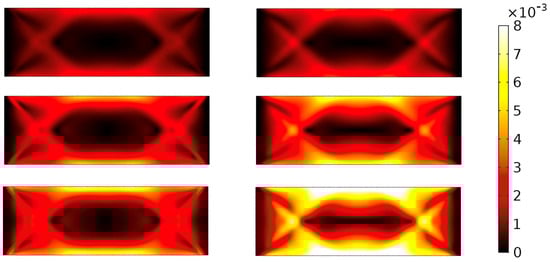 Plot of relative displacements of the two fiber families. The absolute value of displacement is represented in the color scale, expressed in m. The plots are reported for different values of prescribed displacement: −20 mm, −40 mm and −60 mm in compression (left); 20 mm, 40 mm and 60 mm in extension (right).
