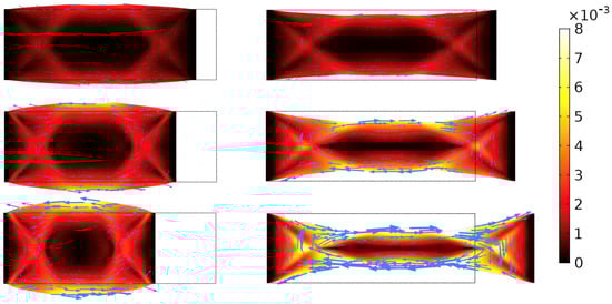 Plot of relative displacements of the two fiber families. The absolute value of displacement is represented in the color scale, expressed in m. The arrows represent the vectorial displacement of the nodes of the mesh. The length of the arrows is proportional to the modulus of the displacement. The plots are reported for different values of prescribed displacement: −20 mm, −40 mm and −60 mm in compression (left); 20 mm, 40 mm and 60 mm in extension (right).