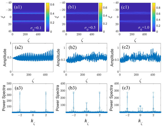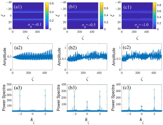 Figure 1(a1,b1,c1) present the propagation dynamics with different values of the self-focusing nonlinearity strength in Equation (3) and a fixed value of the modulation frequency, in Equation (8) (recall is fixed by rescaling). In Figure 1(a1), the main lobe of the ring-Airy beam exhibits nearly periodic oscillations in the presence of the weak nonlinearity. It is seen in Figure 1(b1,c1) that the oscillations gradually extend to side lobes of the beam as the strength of the self-focusing nonlinearity increases. The oscillation amplitude also gradually grows and exhibits a trend towards chaotization with the increase of ; see Figure 1(a2,b2,c2). The respective power spectra of the variable amplitude of the beam are displayed in Figure 1(a3,b3,c3). It is seen that the dominant spectral components, located at , are obviously determined by the aforementioned management frequency (), while the apparent chaotization is produced, with the growth of the nonlinearity strength, by the appearance of long-wave spectral components around .
