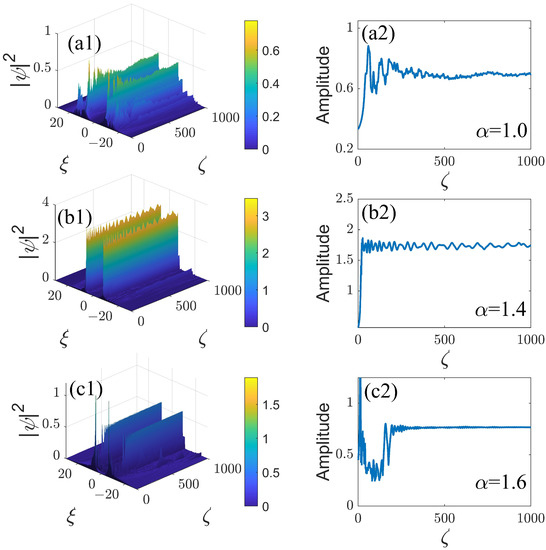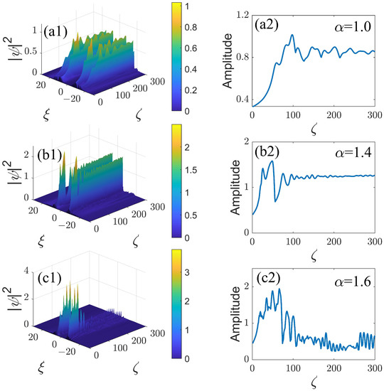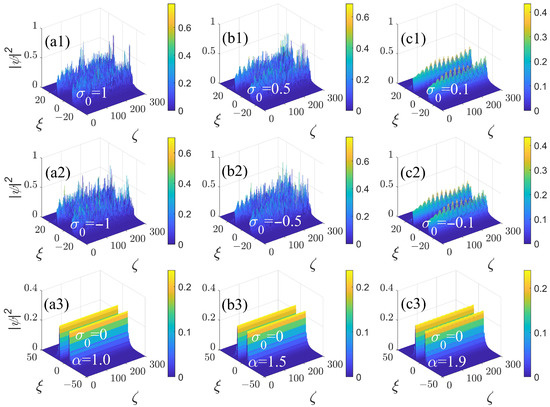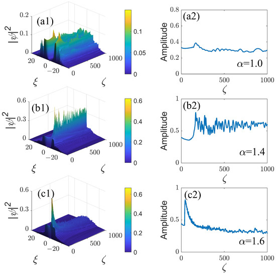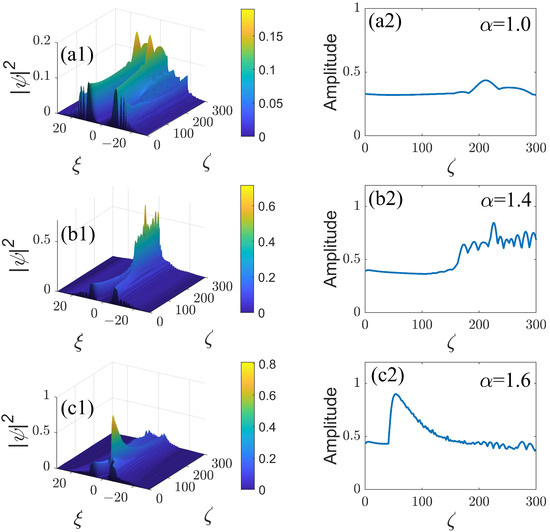 In the case of the combination of the modulation format (9) and self-defocusing, corresponding to in Equation (6), Figure 4(a1,b1,c1) show that the main lobe of the ring-Airy beams tends to autofocus at a certain point, while the sidelobes do not significantly shrink. In the cases of , relatively weak autofocusing occurs at , as seen in Figure 4(a1,a2). As the Lévy index increases, stronger autofocusing occurs at shorter transmission distances in the cases of and (Figure 3(b1,c1), respectively).