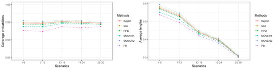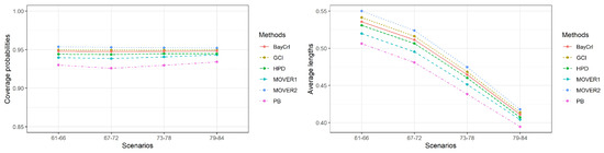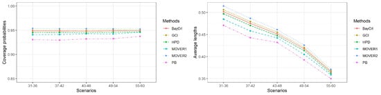 The performances of the proposed methods were evaluated via a Monte Carlo simulation study under the criteria of the average length and the coverage probability of the SCI based on 3000 replications with 3000 pivotal quantities for GCI, for PB, and for BayCrI and the HPD interval. The method that performs the best for a given scenario is the one with a coverage probability higher than or close to 0.95 and the shortest average length. We compare the effectiveness of the proposed methods in various circumstances. Therefore, we considered k = 3, 5 and 10 sample cases. The settings for parameters and sample sizes are reported in Table 1. Meanwhile, the values of the scale parameters were kept fixed at 1.0 without any loss of generality. In addition, and were chosen for constructing BayCrI and the HPD interval []. In Table 2, Table 3 and Table 4 and Figure 1, Figure 2 and Figure 3, PB is the percentile bootstrap approach, GCI is the generalized confidence interval approach, MOVER1 is the MOVER based on ACI approach, MOVER2 is the MOVER based on GCI approach, BayCrI is the Bayesian credible interval approach, and HPD is the highest posterior density interval approach.