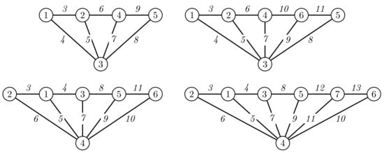 - Case (i). If , i.e., , then the weights of edges , , receive consecutive values from the set and the weights of edges , , attain values from the set . The sum of the numbers in the set equals to the sum of the corresponding end vertex labels of edges, , . The labels of vertices and are only counted once, while the labels of the vertices are counted twice. We obtain the following: