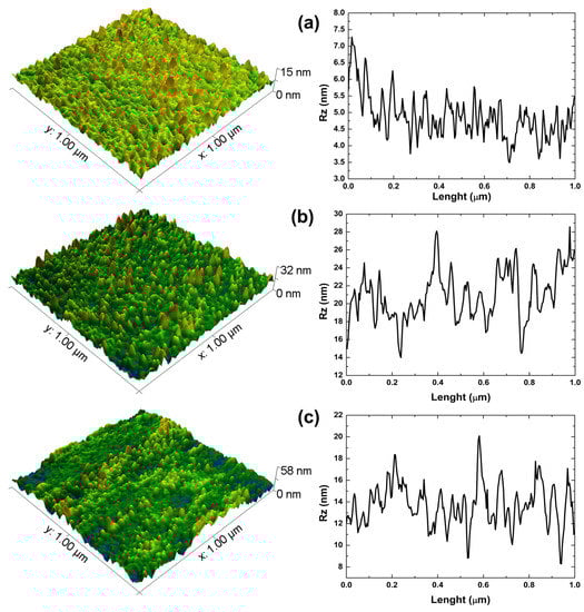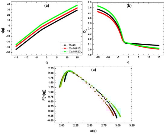The vertical growth dynamics associated with local irregularities of the surface of the films were investigated using their multifractal spectra []. Figure 5 reveals three clear fingerprints of multifractality on the surface of the investigated thin films. Panel (a) shows a deviation from the linear behavior between the mass exponent τ(q) and q. Panel (b) indicates a non-constant relationship between the generalized dimensions Dq and q. Panel (c) presents the usual downward concave curve of the multifractal spectra. Moreover, Table 2 shows the measures that quantify the multifractality of the thin films explicitly [].