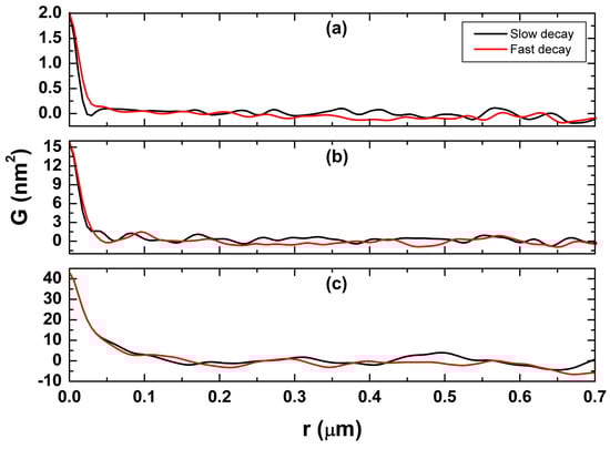 To further analyze the spatial profiles of the samples, we used an important physical parameter often used in film analysis: the ACF, which provides information about the degree of isotropy or anisotropy of the surface microtexture []. Thus, we used this parameter (together with the roughness parameter) to evaluate how the sputtering time affected the spatial distribution and organization of rough peaks on the surface of the Cu/Ni thin films. Herein, the autocorrelation functions were calculated using the AFM topographical maps using Gwyddion 2.59 software []. Figure 2 shows a set of ACFs calculated for these systems, obtained according to the lateral dimension of each AFM image. The red and black lines are associated with the fastest decay direction (τa1) and the slowest decay direction (τa2), respectively, which are angles responsible for dictating the direction and whose autocorrelation function drops down the threshold for their shortest and longest r values [].