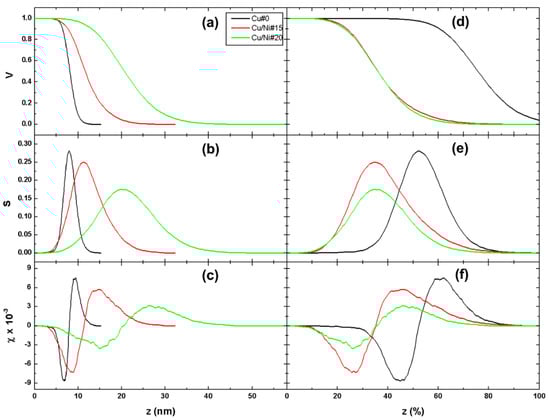 An advanced morphological analysis was performed using Minkowski functionals (MFs). In Figure 3, we see MFs are measures used to describe the geometric characteristics of nanosurfaces. The panels displayed in Figure 3a–c show the MFs computed considering the non-normalized threshold z. In this regard, we can see that it was not possible to make a fair comparison between the samples in the present case. Thus, we also computed the MFs considering the normalized threshold z, as shown in Figure 3d–f. Figure 3d reveals that the Minkowski volume for the Cu/Ni#15 and Cu/Ni#20 samples had a similar pattern when the normalized threshold was considered. This means that the distribution of matter as a function of height was similar in both cases. In Figure 3e,f, let be the normalized threshold associated with the corresponding Minkowski boundary and connectivity peak. We observed that was high for the Cu#0 sample, whereas the samples of Cu/Ni#15 and Cu/Ni#20 had close values of , which can be attributed to their high roughness values. This suggests that their percolative features were similar to each other but different from the percolative properties of the Cu#0 sample.