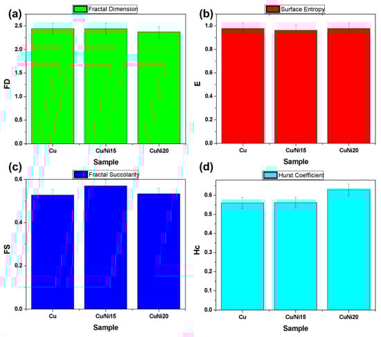 The advanced fractal parameters were used to study the surface microtexture’s irregularities []. The panels displayed in Figure 4 bring four fractal parameters as a function of the sample type. As can be seen, the fractal dimension (FD), Hurst coefficient (H), and topographical entropy (E) parameters showed no statistically significant difference (one-way ANOVA, p > 0.05). The FD values were found to be 2.44 ± 0.12 (Cu#0), 2.44 ± 0.12 (Cu/Ni#15), and 2.37 ± 0.12 (Cu/Ni#20), suggesting that all the films had similar spatial complexities. Due to the direct correlation with the FD value, the H values were computed to be 0.56 ± 0.03 (Cu#0), 0.56 ± 0.03 (Cu/Ni#15), and 0.63 ± 0.04 (Cu/Ni#20), showing that their surface microtextures were dominated by high dominant spatial frequencies []. Furthermore, all films displayed high topographical uniformity (E ~ 1) [,], specifically 0.98 ± 0.05 (Cu#0), 0.96 ± 0.05 (Cu/Ni#15), and 0.98 ± 0.05 (Cu/Ni#20), suggesting that their surface microtextures were composed of 3D spatial patterns evenly arranged over the surface. Such topographical uniformity can be attributed to the surface isotropy exhibited by all surfaces (Str > 0.3). Nonetheless, the fractal succolarity (FS) of Cu#0 was determined to be 0.57 ± 0.01, while Cu/Ni#15 (0.53 ± 0.02) and Cu/Ni#20 (0.53 ± 0.02) yielded similar values which were close to the ideal value (0.5) []. The one-way ANOVA comparison test confirmed that the overall average values were statistically different (p < 0.5). However, the pairwise ANOVA-based Tukey test indicated that the Cu/Ni#15 and Cu/Ni#20 samples showed no statistically significant difference. This proves that the Cu/Ni films have similar surface percolation, which perfectly agrees with our Minkowski functional morphological analysis (Figure 3).