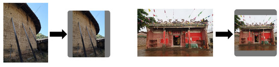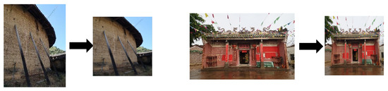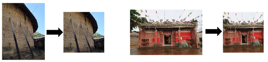 At present, there is no professional ancient architecture dataset for China. This paper adopts the dataset for traditional residential ancient architecture in the Guangdong Province of China as the research and identification object, which was constructed by the team of the South China University of Technology over many years. This dataset includes six types of ancient architecture, including the square-shaped Tulou, Canton ancestral hall, Leiqiong folk house, San-Jian Liang-lang folk house, Hakka walled village, and round Tulou. The images of each architecture type are shown from different viewpoints, comprising the top view, overhead view, internal view, and external view. Examples of the datasets are shown in Table 1. The symbol “--” indicates empty data.