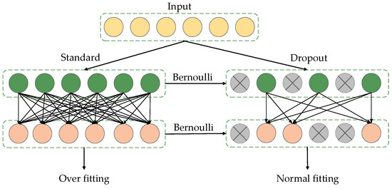 where is a probability vector containing only 0 and 1 elements and obeying a Bernoulli distribution. and represent the weight and bias of the ith node in the next layer of layer l, respectively, represents the feature vector extracted through the Inception V3 network, and represents the output after passing the activation function, . The working principle of dropout in the model is shown in Figure 5.