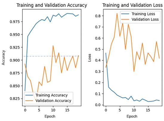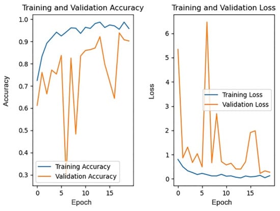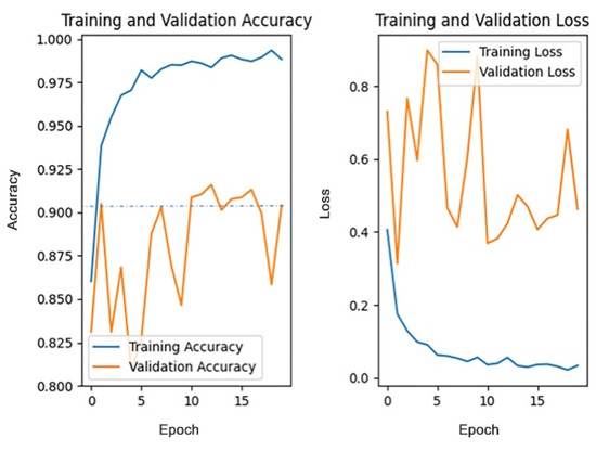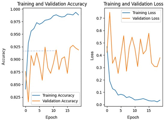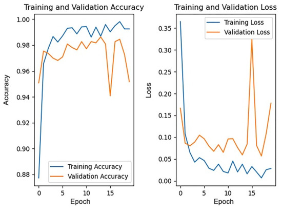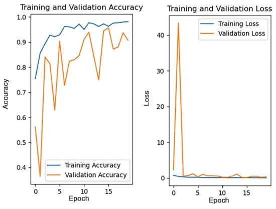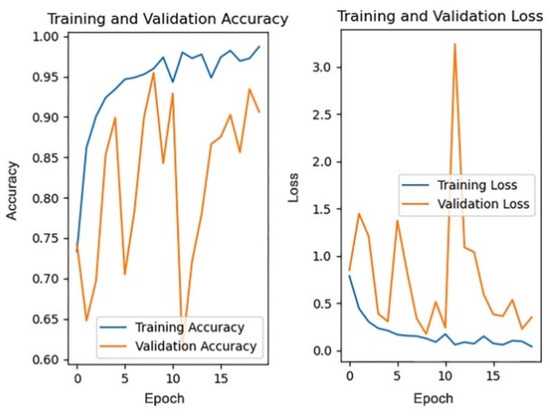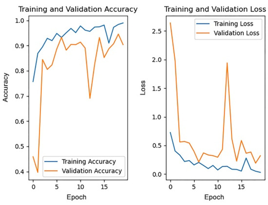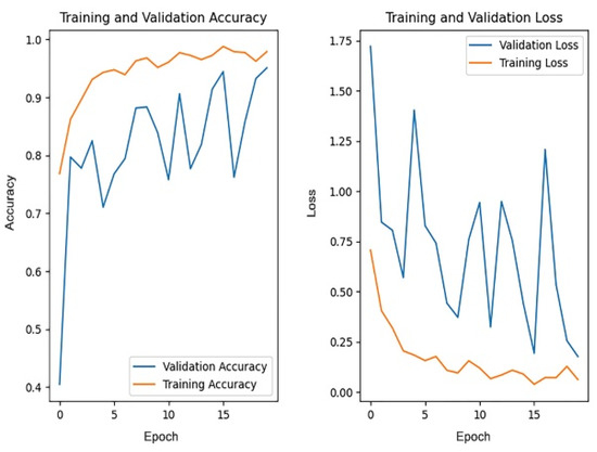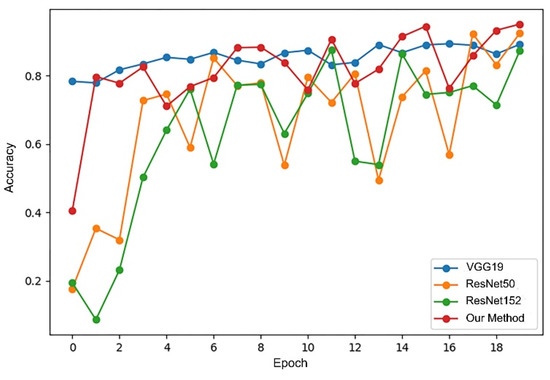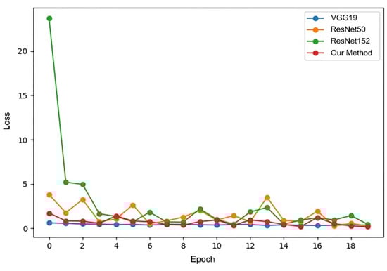 The pre-trained weights on the ImageNet dataset are loaded into the four models, respectively, with each model trained for 20 rounds, then the accuracy of each model on the test dataset and the average training time are compared. Figure 17 and Figure 18, respectively, show the changes in accuracy and loss during the training process of four models.