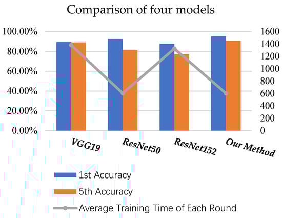 Similarly, we use the 1st accuracy and the 5th accuracy as the evaluation criteria. The 1st accuracy and the 5th accuracy on the test dataset and the average training time of the four models are shown in Figure 19 and Table 6, respectively.