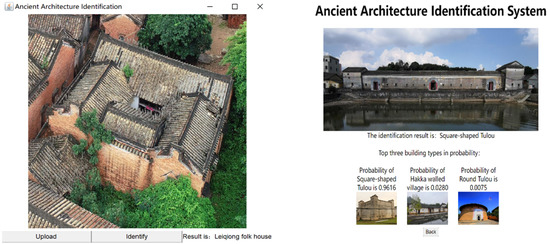 Based on the identification model in this paper, our team has developed the B/S architecture and C/S architecture ancient building recognition system, which improved the work efficiency of the research team and the professionals. The running system is shown in Figure 20, where left subfigure and right subfigure represent the recognition results under the C/S architecture and B/S architecture respectively.