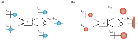 where and ( and ) are the annihilation and the creation operators of the BS input port a (b) as shown in Figure 1a, respectively. means the degree of splitting ratio. When , it applies as a 50:50 BS. From Equation (1), one can calculate the evolution of input state as [110]