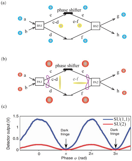 In a traditional nonlinear SUI, many photons are absorbed in the beam combining process, resulting in limited phase sensitivity. To boost the photon number, a deformation of the SUI with a degenerate PA for beam splitting and a BS for wave superposition and interference (called PA + BS scheme) was studied [94]. This scheme is shown in Figure 5b. Consider a vacuum state and coherent state with amplitude injection, one output noise is related to the gain of the PA process by when the transmissivity of BS , and then, the optimum phase sensitivity is obtained