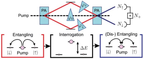 The atomic SUI was first discussed by Gabbrielli et al. in 2015 [54], and then, an experimental demonstration was given by Linnemann et al. in 2016 [49]. Later, experimental studies were reported in [51,52], etc. The schematic of the atomic SUI is shown in Figure 3. It divides into three building blocks: entangled state preparation, interrogation, and nonlinear time reversal for read out. In this kind of SUI, the Spin-changing collisions in a Bose–Einstein condensate are used as the nonlinear parametric process to achieve splitting and combining process, where the corresponding Hamiltonian