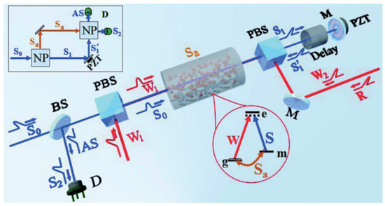 where with and are the coupling coefficients between the light fields and atom, is detuning from the excited state for both the Stokes and Raman write fields. is the amplitude of the Raman pump field, () is the creation (annihilation) operator of the Stokes field, and () is the creation (annihilation) operator of the atom spin field. Here, the pump field is relatively strong such the input Stokes field will be amplified. The amplified Stokes field and the produced atomic spin wave are phase-correlated. Note that the expression (25) has the same form as the SU(1,1) Hamiltonian in Equation (5) for the PA process. The Stokes field can be regarded as the ‘signal’ field, and the atom spin wave can be treated as the ‘idler’ field. Hence, just like the all-optical SUI, the atom–light hybrid interferometer employs nonlinear atomic Raman amplification processes replacing the beam-splitting and combing elements in a traditional interferometer. The schematic diagram is shown in Figure 4. This kind of nonlinear atom–light hybrid interferometer is sensitive to the light field and atomic state, which can be widely used in precision measurement and quantum control with atoms and photons.