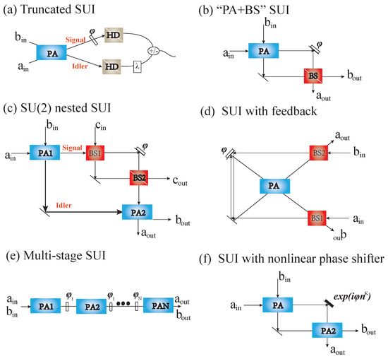 Unlike the traditional SUI where one PA is employed to split and the other PA is used to combine, there are the deformations of SUI that were proposed, such as truncated types of SUI, PA + BS types of SUI, SU(2) nested SUI, SUI with a feedback mechanism, multi-stage SUI, and SUI with nonlinear phase shifter. These types of SUI are shown in Figure 5. In the following, we introduce these types of interferometers.