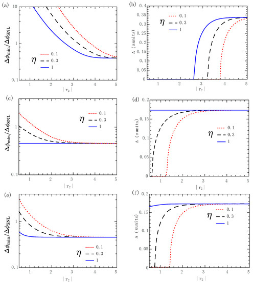 In fact, the phase sensitivity of the SUI is susceptible to internal losses. When the internal loss is introduced, the symmetry of the SUI is broken, and the resulting balanced configuration of the SUI is not optimal for resisting external loss. Here, unbalanced gain gives an additional degree of freedom to optimize the properties of the SUI to reduce the effect of external losses when the internal loss is introduced. M. Manceau et al. pointed out that a broader super-sensitivity phase range and a better overall sensitivity can be achieved at gain unbalancing, as shown in Figure 6, where the internal loss is and the first PA’s gain equals . Figure 6 shows that increasing the gain of the second PA can lead to better sensitivity and a broader super-sensitive phase range [105]. Meanwhile, the balanced case does not provide phase super-sensitivity even for the external lossless case seen in Figure 6a. The sensitivity improves as one increases the gain of the second amplifier. The experiment has verified that the phase super-sensitivity of an unseeded degenerated, nonlinear unbalanced interferometer on direct detection can be preserved even with detection losses as high as 80% by increasing the gain of the PA2 [43].