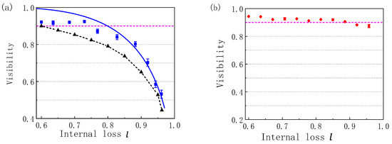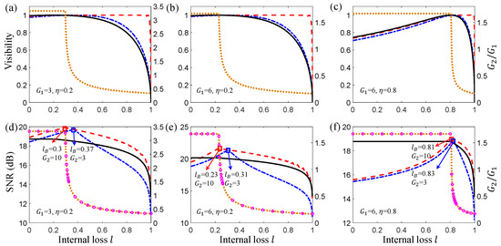 where is the phase-sensing photon number of the SUI. These two output ports are always created or eliminated in pairs by the parametric processes. Note that the output photon numbers depend on the sum of the two arm phases when and assume certain values and the energy conservation . The interference visibilities for these two output ports are given as and . It can be clearly seen that the larger gain can result in almost perfect visibility for outputs [88,112]. Meanwhile, the h port (‘idler’ field) always has a visibility of 100% when . Moreover, the photon numbers of MZI at output g and h are
