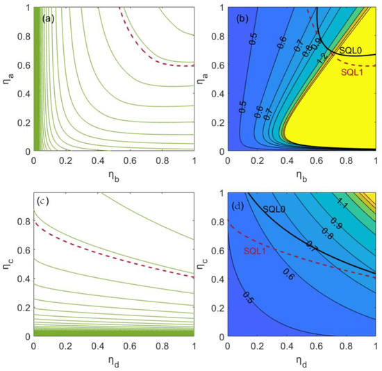 Using the input–output relations of PA and BS, one can obtain the transmission matrix of the interferometers formed by the creation and annihilation operators of the light field. Assume that the phases of the interferometer arms c and d are and , respectively. After the calculation, the operators of SUI’s two final output ports and are dependent on the operators of two input ports and which are obtained as