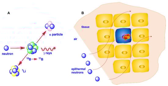 When 10B captures a neutron, the formed 11B isotope is in an excited state which rapidly decays through a fission reaction producing an α particle and recoiling a lithium-7 (7Li) ion. These high-linear-energy transfer (LET) particles dissipate their energy by traveling a distance corresponding to a cell diameter. If a 10B-containing compound is preferentially accumulated within a cancer cell, the irradiation of the tumor area with a neutron flux gives rise to a lethal fission reaction confined within the boron-containing cells, providing selective destruction of the malignant cells saving the surrounding healthy tissues, provided that some requirements are fulfilled, as later discussed (Figure 1).