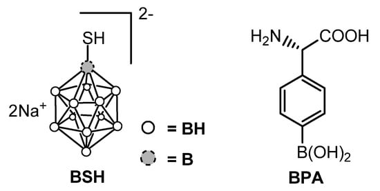 After the failure of the initial trials during the 1950s–1960s in which boric acid and its derivatives were used, the need for more selective boron carriers immediately became clear. Starting from the pioneering work of Soloway [10] in Boston, a huge number of boronated compounds have been synthesized [9,11]. Three molecules have been approved for clinical use, namely sodium mercapto-undecahydro-closo-dodecaborate (or sodium borocaptate, Na2B12H11SH, BSH), L-boronophenylalanine (BPA) and decahydrodecaborate (GB-10). Currently, only two compounds are used for clinical trials, namely BSH, and BPA (Figure 2) which were shown to be safe in humans.