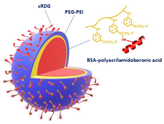 According to the first approach, different boron-rich nanoparticles were obtained by reacting acrylamidophenylboronic acid with chitosan, dextran, or bovine serum albumin (BSA). These nanoparticles show relevant tumor-targeting ability due to the preferential interaction with sialic acid overexpressed in tumor glycans [43]. As an example, nanoparticles were generated from BSA and polyacrylamidophenylboronic, which demonstrated good tumor targeting and significant retention in tumors compared with nanoparticles without boronic acid. Additionally, nanoparticle sizes around 110 nm were observed to be optimal. Coating of the nanoparticles with polyethyleneimine-polyethylene glycol (PEI-PEG) copolymer and further decoration with cyclic Arg-Gly-Asp (cRGD) (Figure 4) significantly increased the circulation time of the particle and their accumulation at the tumor site on a murine hepatoma model [44].