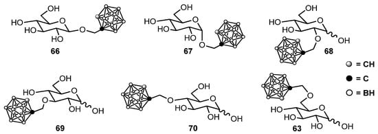 In fact, compound 63 was 500 times more soluble than compound 64. Docking calculations and competition experiments between the glucoconjugates and [14C]-d-glucose in the human CAL 27 cell line demonstrated that, at least for compounds 63 and 64, the affinity for GLUT1 was in the μM range, in contrast to the low mM-affinity displayed by d-glucose, so it is expected that compounds 63 (and 64, if solubility problems can be solved) can target GLUT1 in vivo, competing with free d-glucose. Finally, compounds 63–65 performed much better than BSH or BPA in cell-uptake studies. The exploration was further extended to d-glucose derivatives bearing the carboranylmethyl group in positions other than 6 [60]. The synthesized products are shown in Figure 6.