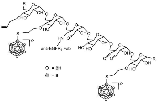 Finally, a potential agent for BNCT was obtained from dextran by allylation of the polymer, reaction with BSH, and derivatization with an antibody against epidermal growth factor receptor 1 (anti-EGFR1 Fab) (Figure 7) [64].