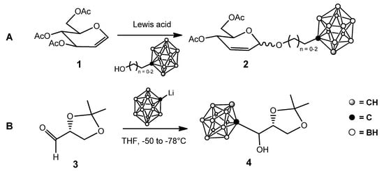 A commonly employed strategy to improve the water solubility of o-carboranes is their conjugation with a highly water-soluble moiety. Among different classes of natural and synthetic compounds, carbohydrates attracted attention—although their use increased only in recent years, probably because classical carbohydrate chemistry and boron chemistry were traditionally two distinct “chemical worlds”. The first examples of sugar-carborane conjugates exploited the so-called Ferrier rearrangement of glycals [17] and the reaction of lithiated carborane with protected aldehydo sugars (Scheme 1) [18], together with a few other approaches [19,20].