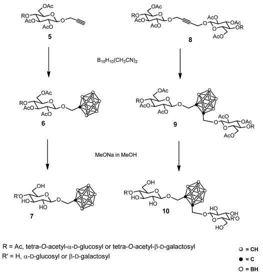 At the end of the last century, mono- and bisglycosyl carboranes 7 and 10 were obtained [21,22] from the reaction of a decaborane–acetonitrile complex (6,9-bis-(acetonitrile)decaborane) with alkynyl glycosides 5 and 8, which gave a stimulus towards the synthesis of boron-containing sugars (Scheme 2).