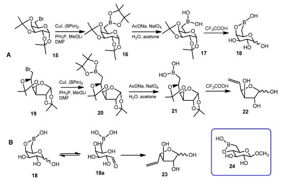 In a first report, the boronic acid was introduced by substituting the hydroxyl group at position 6 of d-glucose and d-galactose with a boronic acid. 6-Bromo-6-deoxy sugars 15 and 19, protected as isopropylidene acetals, were submitted to a copper(I)-catalyzed coupling reaction with bis(pinacolato)diboron, followed by a deprotection reaction (Scheme 3A).