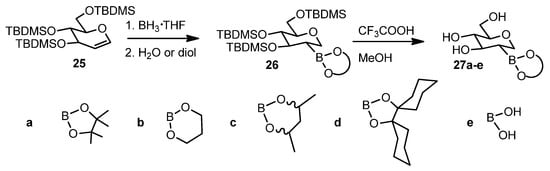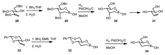 In 2018, Aoki’s group reported the synthesis and biological evaluation of 1,2-dideoxy-d-glucopyranos-2-ylboronic acid as shown in Scheme 4 [36].