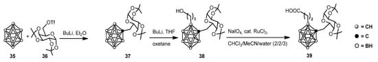 The group of Hey-Hawkins has been interested in the derivatization of dicarba-closo-dodecaboranes, ranging from glycosylphosphonates [49] to sugar-containing ortho-carbaborane-9-thiol, for a long time [50]. More recently, a building block containing galactose and an arm for peptide conjugation was described [51]. The reaction of lithiated ortho-carborane with bis-isopropylidene-protected α-d-galactopyranose 6-triflate 36 gave 37. The installation of a propionyl appendage was obtained by lithiation of 37, reaction with oxetane, and perruthenate oxidation. The carboxyl part can then be used for further conjugation (Scheme 6).
