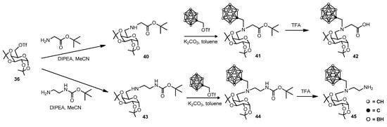 It is interesting to note that although the silyl protection of ortho-carborane is usually used to guarantee monosubstitution, here the appropriate conditions for monoalkylation of unprotected ortho-carborane have been set. In an evolution of this approach, two building blocks for the conjugation of carboranes to biomolecules were described (Scheme 7). The reaction of α-d-galactopyranose 6-triflate 36 with glycine t-butyl ester or with mono-Boc-ethylenediamine gave derivatives 40 and 43.