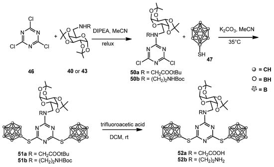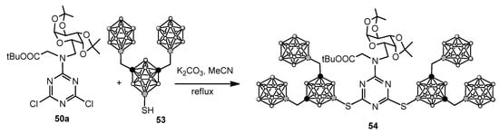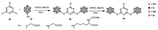 Starting from a previously proposed approach [53], the same group exploited cyanuric chloride 46 and 9-mercapto-meta-carborane 47, which has a highly nucleophilic thiol group, as a platform to quickly generate compounds with chemical diversity and high boron loading.