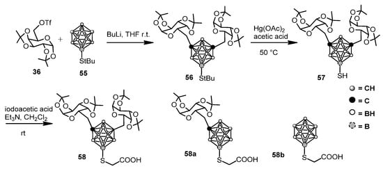 Compound 47 was also used as a scaffold and decorated with two galactosyl moieties and a carboxymethyl group which allowed the conjugation with neuropeptide Y (NPY), known to be recognized by tumor-overexpressed G protein-coupled receptor (GPCR) [57]. Compound 47 was protected as t-butyl thioether 55 then alkylated with galactosyl triflate 36 after deprotonation of the cage carbon atoms with n-butyllithium (Scheme 11). Thiol deprotection and alkylation with iodoacetic acid afforded 58. Compounds 58a and 58b were obtained in an analogous way and were coupled to the lysines of NPY peptide by a combination of automated and manual solid-phase peptide synthesis (SPPS), generating a series of products with different boron loading and sugar content. The isopropylidene-protecting groups of galactose were removed during the final cleavage of the peptide from the resin.