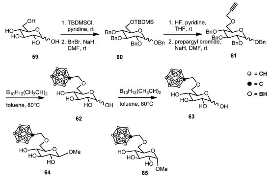 In a similar work, a peptidic ligand for gastrin-releasing peptide receptor (GRPR) was decorated with the same building block 58 and similar results to those obtained using NPY. The most interesting aspect is the demonstration that the exchange of l-galactose for d-galactose prevents the uptake of the conjugate by liver cells uptake, which shows an even higher selectivity. This observation, together with the very low toxicity of the conjugate, is promising, as one of the issues of BNCT is the clearance of the boron agent by the liver and kidney. Usually, BPA is typically administered in a dose of 250–330 mg BPA/kg body weight, although higher doses have been used [58]. Compounds able to accumulate into the tumors and escape clearance can be administered in a lower dose, allowing the design of more complex compounds, as in the present case. When a compound is expected to require being administered in high doses, the simplest synthesis would be planned to avoid a prohibitively high cost of the boron agent. Following this approach, the group of Ekholm developed the synthesis of d-glucose derivatives bearing a carboranylmethyl substituent in position 6, as illustrated in Scheme 12 for compound 63. Compounds 64 and 65 were obtained analogously [59]. The compounds showed low toxicity, high cellular uptake, and surprisingly, compound 63 had high water solubility, not only when compared with BPA but also compared to 64 and 65.