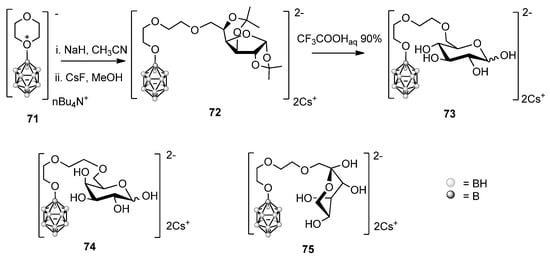 Dodecaborate derivatives of d-glucose, d-galactose and d-fructose were obtained by reaction of isopropylidene protected sugars with the oxonium salt of closo-dodecaborate 71 [15] giving the desired conjugates 73–75 in good yields and a few synthetic steps (Scheme 13) [62]. The synthesis is illustrated for the preparation of compound 73, the syntheses of 74 and 75 following the same scheme. It is interesting to note that when benzyl protecting groups were used instead of isopropylidene, it was not possible to remove them by standard hydrogenolysis.