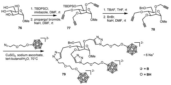 Starting from mannoside 76, protection of the 6-OH and propargylation of the remaining hydroxyl groups gave intermediate 77. The silyl group in position 6 of the mannose moiety was exchanged with a benzyl group or with a fluorescent probe (not shown) and the three propargyl groups submitted to a “click” reaction to give the final compound 79. 79 (and its fluorescent analog) was extensively studied in vitro and in vivo, showing low toxicity, acceptable accumulation but high retention in tumor cells, although also the clearance from blood was quite slow. The mechanism of uptake and retention is not clear, but it appears evident that it does not involve sugar transport proteins, as mannose, the core of the compound, is buried by all the dodecaborate clusters. The compound is interesting regardless and deserves further investigation.