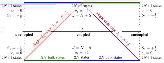 Schematic correlation diagram for the crossover of the superband energy level structure of the spin- system with Hamiltonian (10) as function of a single control parameter. The bulk states (blue color) belong to the same superband for all values of the control parameter; the edge states (two shades of red) change the superbands under the control parameter variation. The value of is displayed for each edge state.