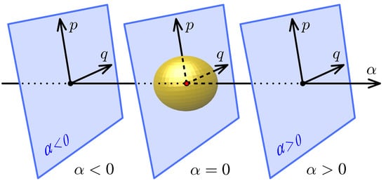 According to our general conjecture, which was already used for the -systems in [1,15], and which we expect to apply to the -systems as well, the number of gained/lost quantum levels, or the spectral flow, equals the Chern number calculated for the -eigenbundle over the closed surface surrounding the degeneracy point in the full parametric space whose coordinates include slow dynamical variables and formal control parameter. Figure 2, which illustrates the model -system Hamiltonian (1) of [1], can also represent the full parameter space of the quaternionic Hamiltonian (10) with two slow degrees of freedom or of its local approximations (19). To that end, it is sufficient to imagine that the planes in Figure 2 are four dimensional (two degrees of freedom) and the sphere surrounding the isolated degeneracy point at 0 is .
