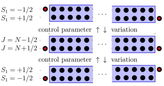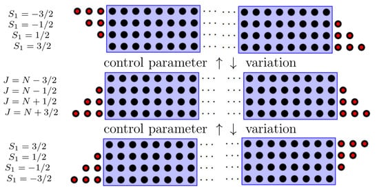 Comparing the topological modifications of the semi-quantum eigenfunction bundles to the evolution of the energy spectrum of the parent quantum system, we find that the number of redistributed quantum energy levels equals (with appropriate choice of the sign) the Chern numbers associated with the corresponding degeneracy point of the semi-quantum eigenvalues. Figure 3 illustrates schematically the rearrangement of the set of basis functions describing the two bands of the spin- axially symmetric model system. The basis functions are classified according to their axial symmetry and describe the “edge” states (with ) belonging to different bands at various values of control parameter and “bulk” states (with ) belonging to the same band at all different regular values of control parameter. The most simple generic qualitative modification of the energy bands in the slow-fast system with one slow degree of freedom consists of the jump of the first Chern class of the semi-quantum system and in the redistribution of the single quantum level between two energy bands in the corresponding quantum system. In the case of additional symmetries, the concepts of local delta-Chern and of the orbit of degeneracy points should be properly introduced and applied [14,15]. For , the model Hamiltonian (1) has two degeneracy points of semi-quantum eigenvalues occurring at the north and south poles of the classical phase space (which we denote by and , respectively) at two different isolated values of control parameter. The associated redistribution of the edge energy levels is represented in Figure 3 as the modification of the set of basis functions associated with each band under the control parameter variation. Extension to arbitrary spin does not change the number of degeneracy points of Hamiltonian (1) but results in more complicated simultaneous degeneracy of all bands. Splitting the basis set into the edge and bulk states for the case of is represented in Figure 4. From this figure, we can derive easily the number of lost/gained energy levels for each of the bands of the system after the critical control parameter value associated with the isolated degeneracy is crossed. For the band attributed in the uncoupled limit to a particular fixed value of , the number of the lost/gained levels equals (depending on the direction of the assumed control parameter evolution) . At the same time, this number equals (to a sign convention) the first Chern number of the corresponding line eigenbundle component defined over the 2-sphere surrounding the degeneracy point (yellow sphere in Figure 2 surrounding the red point).