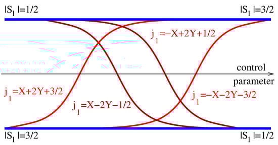 Due to the invariance of (19) under spin-inversion (7), all eigenvalues of its semi-quantum form are double degenerate, i.e., they constitute Kramers doublets. At the point (cf. Figure 2), all semi-quantum eigenvalues become degenerate. For half integer , this means that the qualitative phenomenon of the redistribution of energy levels is not elementary, and therefore—not generic. Nevertheless, it is possible to calculate the number of quantum energy levels, which should be transferred between the superbands by using the correlation diagram relating the limits of the entire band structure. This can be done for each super-band directly by comparing the distributions of states over the values of momentum