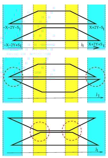 Consider now the total number of the slow subsystem basis wavefunctions which are eigenfunctions of , the momentum of the slow -resonant SO(2) symmetry, with eigenvalue k, and the number of slow-fast basis functions for each spin basis component with as function of the integral of motion in (6). We say that these functions give, respectively, the slow and the -specific slow-fast distributions of basis wavefunctions. Note that follows from after a trivial linear shift of its argument k by , so that . Quantum distribution is a piecewise function which combines a linear staircase-function and, depending on the relative values of X and , a step-function or a constant function [30]. In the classical limit of large X and Y, we can ignore the ℏ-small steps and approximate the distribution by the Duistermaat–Heckman diagram [31] representing the volume of the reduced slow phase space as function of the value k of momentum K. By the Duistermaat–Heckman theorem, since the total slow phase space and the reduced spaces are of respective dimensions 4 and 2, this diagram is piece-wise linear, and it can be further argued, that in our case, it is symmetric with respect to , and has the form of a trapezoid. Shifting for each components as shown in Figure 6, we obtain similar diagrams for each component of each superband . In particular, it can be seen that the number-of-state function for superband is a sum of two distributions , which are shifted one with respect to another by . It becomes clear that the difference in the number-of-state function for different superbands is localized in the four regions near values corresponding to the vertices of the diagram with . In order to visualize better the number-of-state function for superbands, we join the distributions in two alternative graphical ways, as depicted in Figure 6, middle and bottom, where the parts that are important to further analysis are marked by red dashed circles.