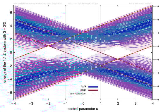 In this particular numerical example, conical semi-quantum eigenvalue degeneracies at points and (18a) occur at and , respectively, and are associated with the transfer of single states and in the same direction (upwards when increases), while degeneracies at points and (18b) occur at and (see Figure 7), and are associated with the transfer of states in the opposite direction. Four states changing superbands under control parameter variation are named edge in Figure 7 and marked by two shades of red. In order to visualize better internal structure of superbands formed by 480 bulk states, three different colors are used to represent bulk states depending on their value. Note that the internal structure of superbands strongly depends on the numerical values of but we do not discuss it in this paper devoted to redistribution phenomenon.