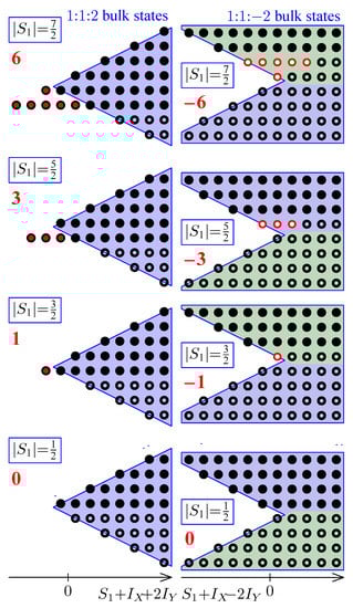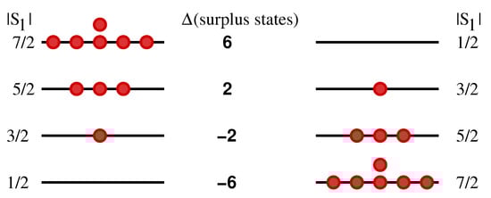 As can be seen in Figure 6, the structure of the trivial (uncoupled) limit superbands depends only on and not on spin S itself. We compute the number of quantum states transferred between the energy superbands during the crossover of the trivial limit band structure. This can be done for an arbitrary , if we first compare all superbands with to the superband with minimal number of states for each -value of the integral of motion. This comparison gives the distribution over of the number of surplus states in superband (see Figure 8), i.e., states, which do not find counterparts in the superband . Manipulation with generating functions [30] allows to obtain an explicit expression for the number of surplus states with given for each superband with given . The same expression can be deduced directly from Figure 9, where the surplus states of the spin-oscillator (left column) and missing states of the spin-oscillator (right column) are marked by filled and empty red circles, respectively. Thus, the surplus state of the Dirac oscillator approximating Hamiltonian (10) with spin- near the pole has an extremal value of .